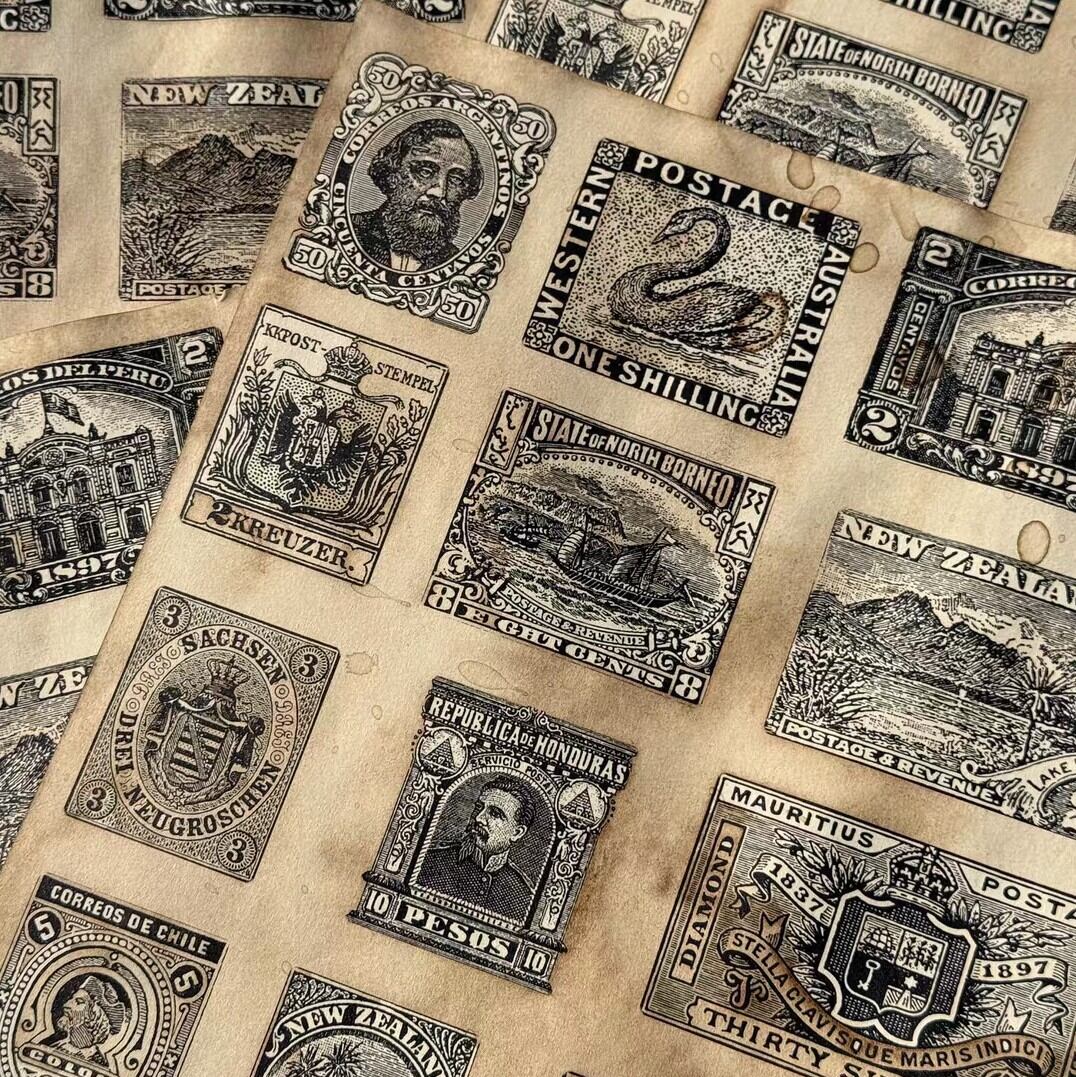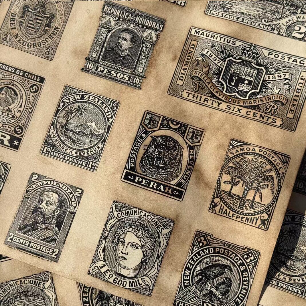 海外 素材紙 珈琲染 モノクロ切手